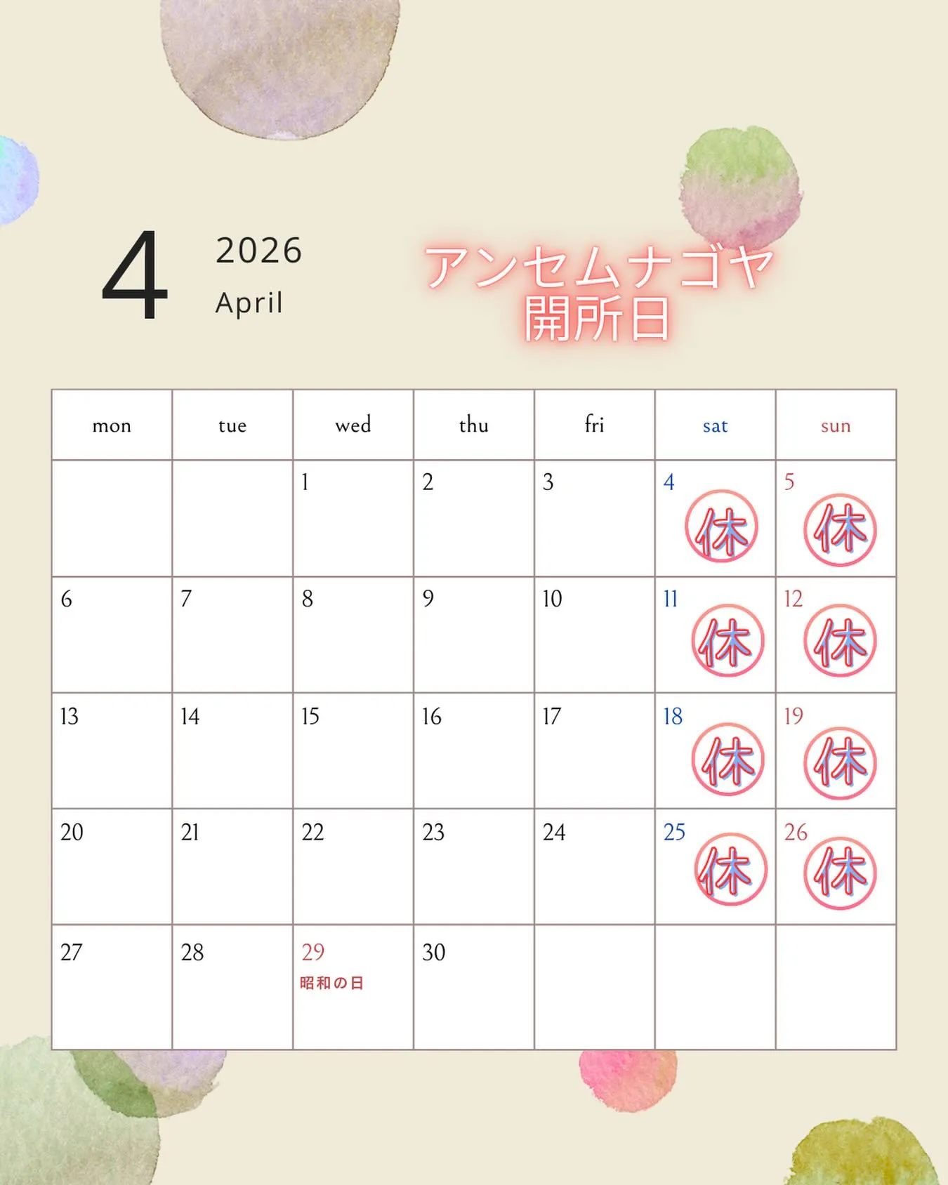 . 2026/03/01 . 4月の開所カレンダーです🌸 体験・見学随時受付中です💁 【サービス提供時間】10:00〜15:00 【営業時間】9:00〜17:30 📞052-622-8080 📧antem758@outlook.jp #就労継続支援b型 #名古屋市緑区 #アンセムナゴヤ #晃生 #障がい者求人